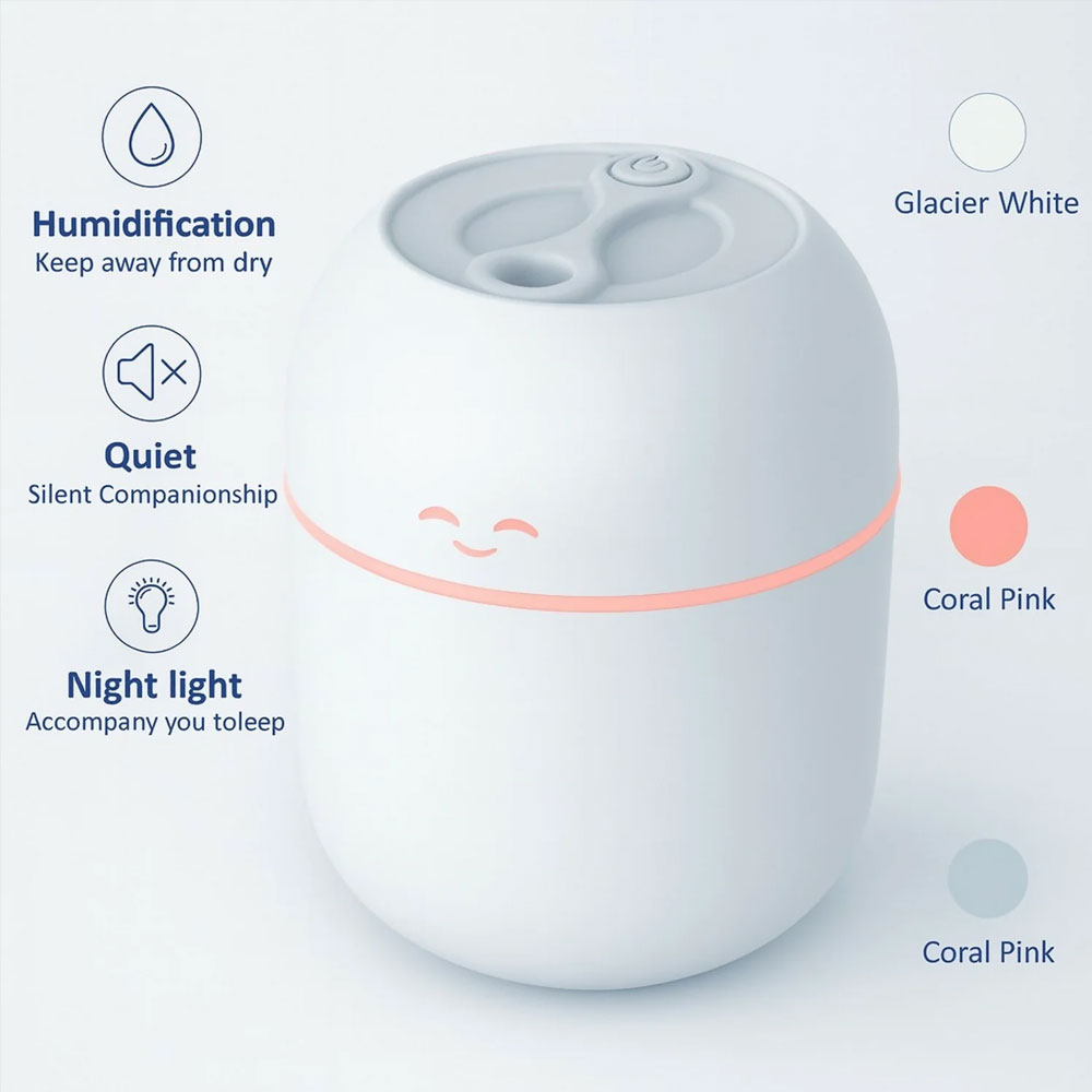 Bring comfort and freshness to any room with this adorable USB humidifier featuring dual mist modes, ultra-quiet performance, and a warm soothing night light. Designed with a cute minimalistic face and compact body, it blends perfectly into bedrooms, work desks, kids’ rooms, cars, and small spaces.