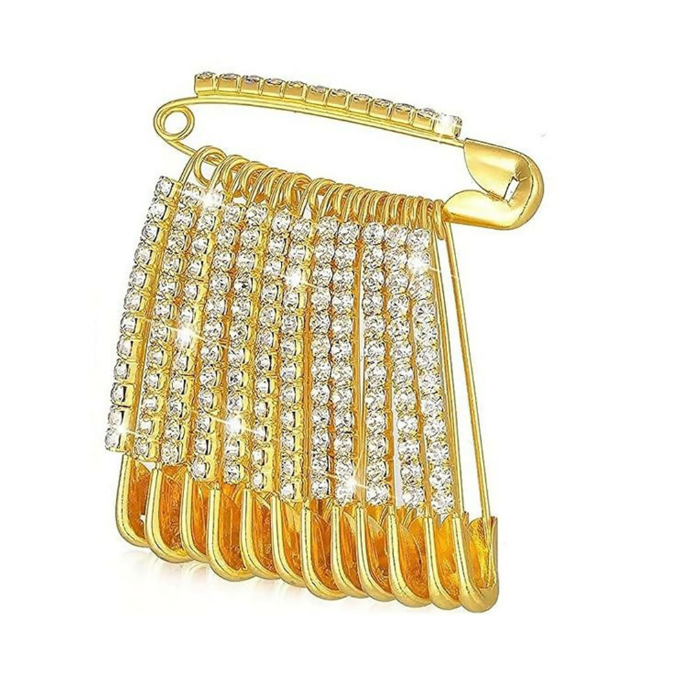 Add a touch of glamour and modern edge to any outfit with this stunning gold-tone safety pin brooch. This unique piece features a large, secure safety pin base, decorated with a row of sparkling, high-quality rhinestone crystals.