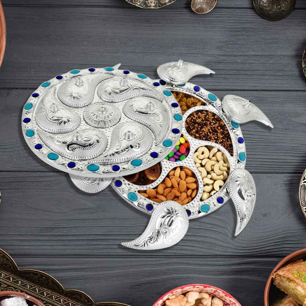 Traditional look serve ware dry fruits box for modern homes. It’s stylish outlook and compartment make it beautiful This tray set is designed in a special way to enhance your dining table. The body of the tray set is well designed. The tray gives a amazing look in the drawing room or dining table. Ideal for daily use and gifting. Stylish and trendy look, food safe and durable. Embossed graphics create luster and classic gaze. This Box has four section where in you can easily arrange Dry Fruits, Chocolate, Mouth Freshener, Sweet. Antique design Dry Fruit Mukhvas Box Mouth Refreshment Box.