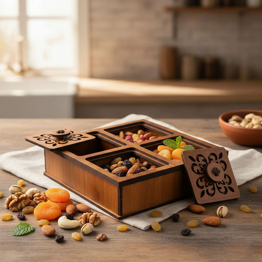 Add elegance and organization to your serving experience with this premium square dry fruit storage box designed with four separate compartments and individual carved lids. Each section comes with its own lid, making it ideal for storing and serving different dry fruits, mukhwas, nuts, sweets, or snacks without mixing flavors.